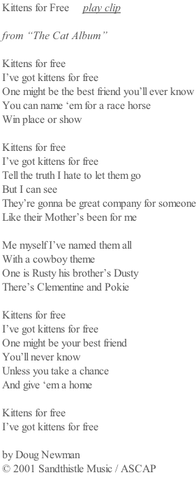 Doug Newman Music - page two Doug Newman Albums Doug Newman Song Lyrics Doug Newman : Calendar Doug Newman : Contact Doug Newman photos Doug Newman : Press, Reviews Doug Newman: News Guestbook Doug Newman Music - page three Doug Newman Links © Doug Newman The Cat Album by Doug Newman Google Play Amazon iTunes