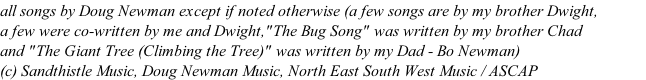 Cascade Creek by Doug and Dwight Newman My Dog Has Fleas - Doug Newman a little tune (a silly little tune) - Doug Newman I Love the Rain - Doug Newman Goin' to Winfield (Winfield Rag) Send Her Back to Me - Doug Newman Fishing with Grandpa a silent rain - Doug Newman Kittens for Free - Doug Newman Whistle Tune - Doug Newman The Sandhill Waltz The Coming of the Rain - Doug Newman Good Morning  - Doug Newman Ba Ba Ba - Doug Newman Turning Orange - Doug Newman Guitar Happy Time - Doug Newman the bug song - Doug Newman Mr. Spider - Doug Newman Indian Summer's Raga Lullaby - Doug Newman Old MacDonald's Farm Living in His Shoe - Doug Newman Happy Happy Birthday - Doug Newman I Loved Ginger - Doug Newman Gibson lg3 guitar - Doug Newman A Cowboy's Lament - Doug Newman (c) Sandthisltle Music / ASCAP   Indian Summer's Lullaby - Doug Newman bio - Doug Newman Song Lyrics: Doug Newman Contact: Doug Newman page two : Doug Newman Music Sea Anemones - Doug Newman page three : Doug Newman Music Guitar and Mandolin Serenade Doug Newman albums- Doug Newman Say That I Love You - Doug Newman A Country Boy and Girl - Doug Newman Ever the Rain          (with Mandolin) Bubbles in the Sea Doug Newman Music.com Cascade Creek              (banjo instrumental) Don’t Cry Buddy the Doggone Cricket Doug Newman music page five Bubbles in the Sea Six String Rag                      (mandolin instrumental) 14 Six String Rag - Doug Newman clip.mp3 Skating by Moonlight         (mandolin instrumental) The Archipelago (guitar instrumental) Doug Newman - The Archipelago Skating by Moonlight by Doug Newman Bye Bye Love             (banjo instrumental) catalbum.com music: page one Parfinagled Spring Pudding - Doug Newman I Hear the Wind - Doug Newman Aint Comin' Back - Doug Newman Wish You Knew - Doug Newman Go Away from My Window - Doug Newman page one b doug newman page one handwritten © Doug Newman Scottish Mandolin As Long As I’ve Got You The Happy Ants  from “The Sandhill Waltz” from “The Sandhill Waltz” from “The Sandhill Waltz” from “The Sandhill Waltz” from “The Sandhill Waltz” from “Ba Ba Ba” from “Ba Ba Ba” from “Ba Ba Ba” from “Ba Ba Ba” from “Bugs and Critters” from “Bugs and Critters” from “Bugs and Critters” from “Bugs and Critters” from “Bugs and Critters” from “Bugs and Critters” from “Ba Ba Ba” from “Ba Ba Ba” from “Ba Ba Ba” from “The Cat Album” from “The Sandhill Waltz” from “Rain Songs (Songs for a Rainy Day” from “Rain Songs (Songs for a Rainy Day” from “Rain Songs (Songs for a Rainy Day” from “Songs I’m Singing Right Now” from “Guitar Tunes” from “Guitar Tunes” from “Guitar Tunes” from “Guitar Tunes” from “Ba Ba Ba” from “Mandolin Tunes” from “Mandolin Tunes” from “Tin Can Avenue” from “Mandolin Tunes” from “Guitar Tunes” from “Guitar Tunes” from “Red Beans and Rice and Other Songs of the Dusty Trail” from “Red Beans and Rice and Other Songs of the Dusty Trail” from “Red Beans and Rice and Other Songs of the Dusty Trail” from “Red Beans and Rice and Other Songs of the Dusty Trail” The Giant Tree (Climbing the Tree) by Bo Newman available at iTunes ,Google Play The Giant Tree by Bo Newman - Doug Newman from “The Sandhill Waltz” from “Sierra Skies” from “Tin Can Avenue” from “Mandolin Tunes” from “Critters and Bugs” (with Mandolin) Google Play iTunes amazon (mostly song clips - with verse and chorus) (click on the titles to play) 03 good morning by doug newman clip.mp3 11 the coming of the rain - doug newman clip.mp3 15 - I love the rain by doug newman clip.mp3 10 Ain't Comin' Back - Doug Newman clip.mp3 01 A Silent Rain by Doug Newman clip.mp3 from “Bugs and Critters”